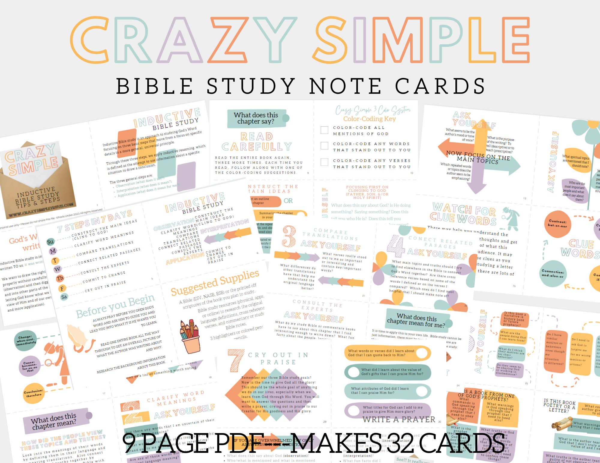 Instant and lifetime access to the full color 9-page pdf file. Makes 32 instructional cards FULL of helpful steps & insights into inductive Bible study. Great Bible study resource!