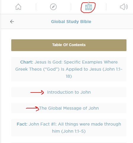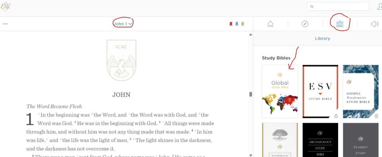 Click the link above and it will bring you to the ESV Bible and you can choose the book of John on the menu at the top. It will most likely take you to Matthew Chapter one so you will need to choose John. Click the book icon (this is a computer screenshot; it will look different depending on what devise you access the website or app from). Once you locate and click the book icon, it will bring you to a collection of study aides. The Global Study Bible is FREE, and it is an excellent resource for in-depth study.