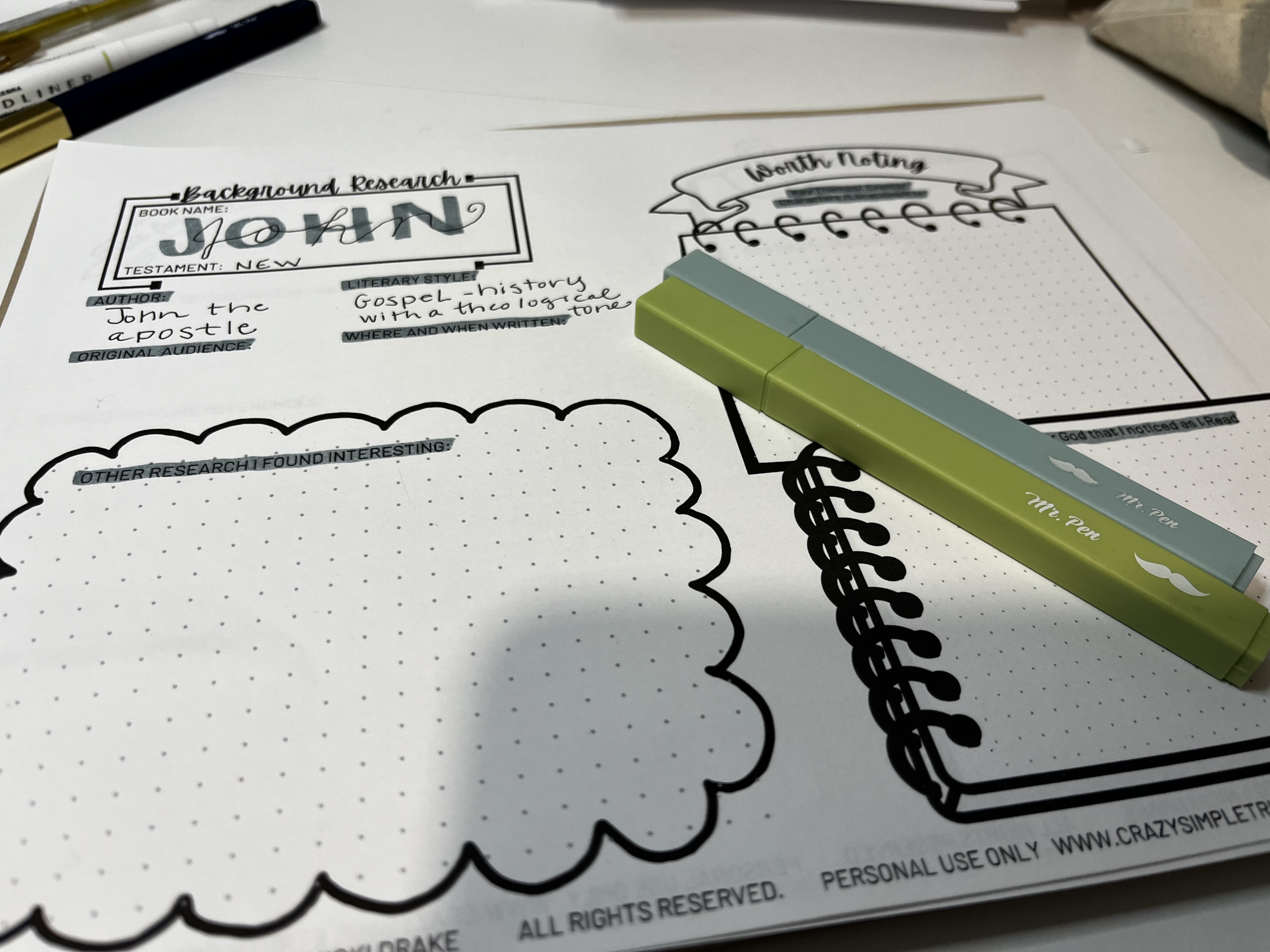 Before you begin to study the Book of John, please take the time to read the entire book and also, research the book background so that you understand the context of the book. This step is very important. If you are using the John Chapter Mapping Workbook, you have a different background research worksheet, you can use either. I designed this one to fit in my new Bible Study Binder system that I am trying to assemble (videos on YouTube). But you do what works for you!!!